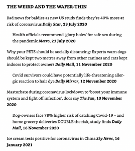 I never felt the disabling fear which many of the population experienced as a result of these communications – and Dodsworth’s book gives verbatim accounts from ordinary people whose lives were paralysed, and in some cases destroyed, by fear of The Pandemic and are now angry as hell about it – but had a growing sense of unease as the rhetoric grew. Looking back, although I was a willing participant in the ‘responsible’ behaviours required of us during the first wave of the pandemic, I was unsettled by the tone and scale of the reporting rather than the information itself. Language was melodramatic and alarmist in ways which felt to be previously the domain of The Daily Mail (unofficial mission statement ‘to scare the fuck out of old people’) and I switched off Radio 4 which I had listened to morning and evening almost all my life because it seemed to have abandoned balanced reporting and become part of the fear machine. I felt particularly troubled by the blunt instrument ‘Don’t Kill Granny’ campaign aimed at teenagers, which seemed cruel and insensitive for those young people who had lost elderly relatives to the virus and added guilt to the mental health burdens being piled on the young.